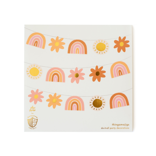 A bohemian dream! Featuring the prettiest boho colors and shiny gold foil, these thingamajigs are totally made of peace and love! What exactly are thingamajigs, you ask?! They are our favorite do-it-all party decorations! String them together to make a garland, attach them to balloons, hang them on the wall...you decide! **Product Details: Illustrated by Alyx House | Package contains 16 die-cut pieces + 20 feet of twine for hanging | Pair Thingamajigs with our Say Everything Garland Set (sold separately) to add a message and create a custom garland that is all your own!