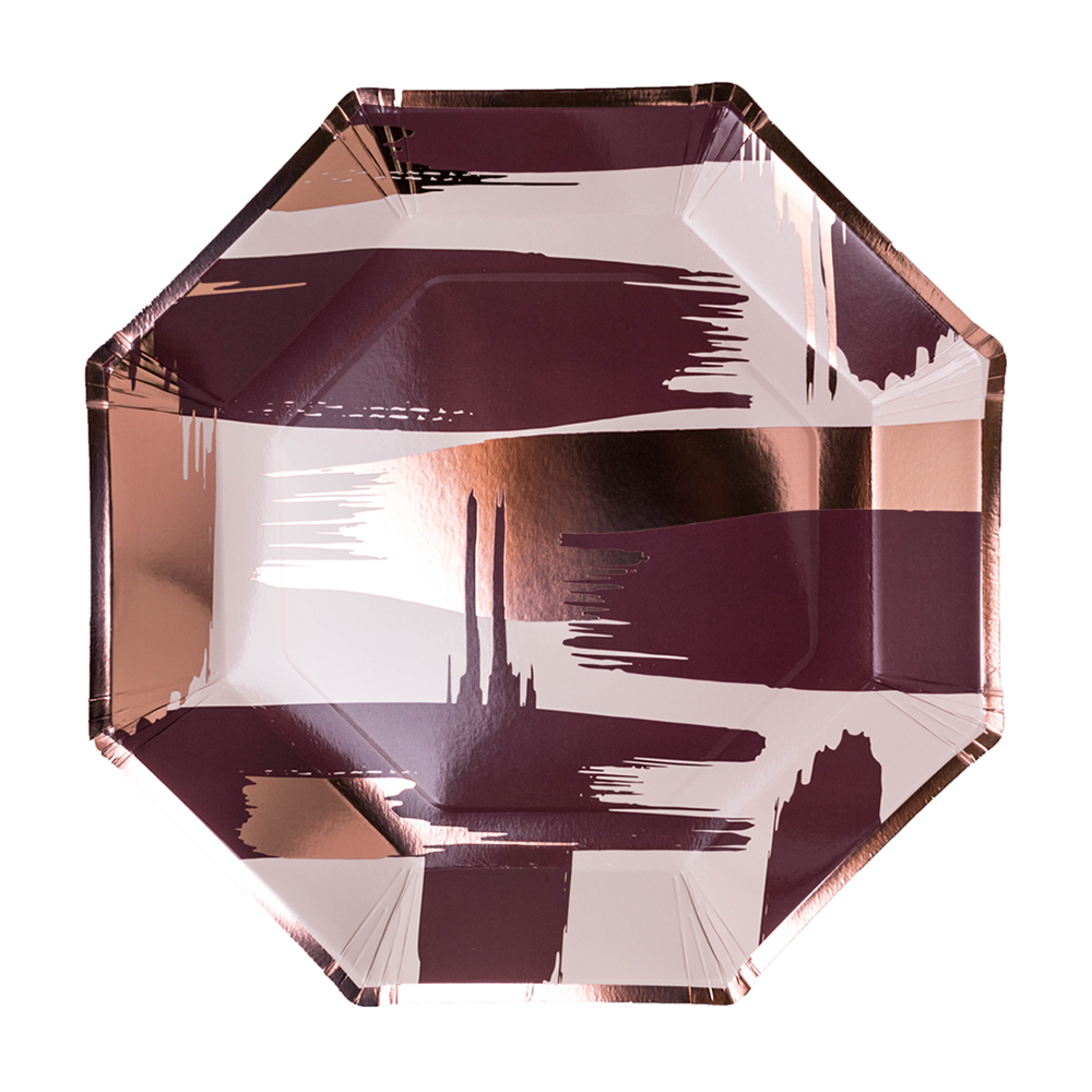 Beautiful and versatile, the Jollity & Co Mauve-elous collection is created to bring stylish one-time use party goods to the most elegant of occasions. Inspired by the beauty that is created in art, the collection features a mix of brushstroke and paint splatter elements with a two tone mauve color palate and rose gold finishes.