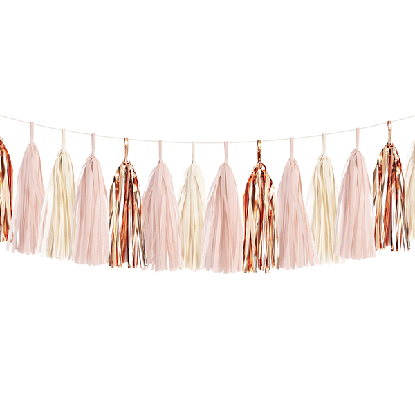 This beautiful tassel garland kit is perfect for showers and weddings, with its dreamy blush, rose gold, and cream color palette.